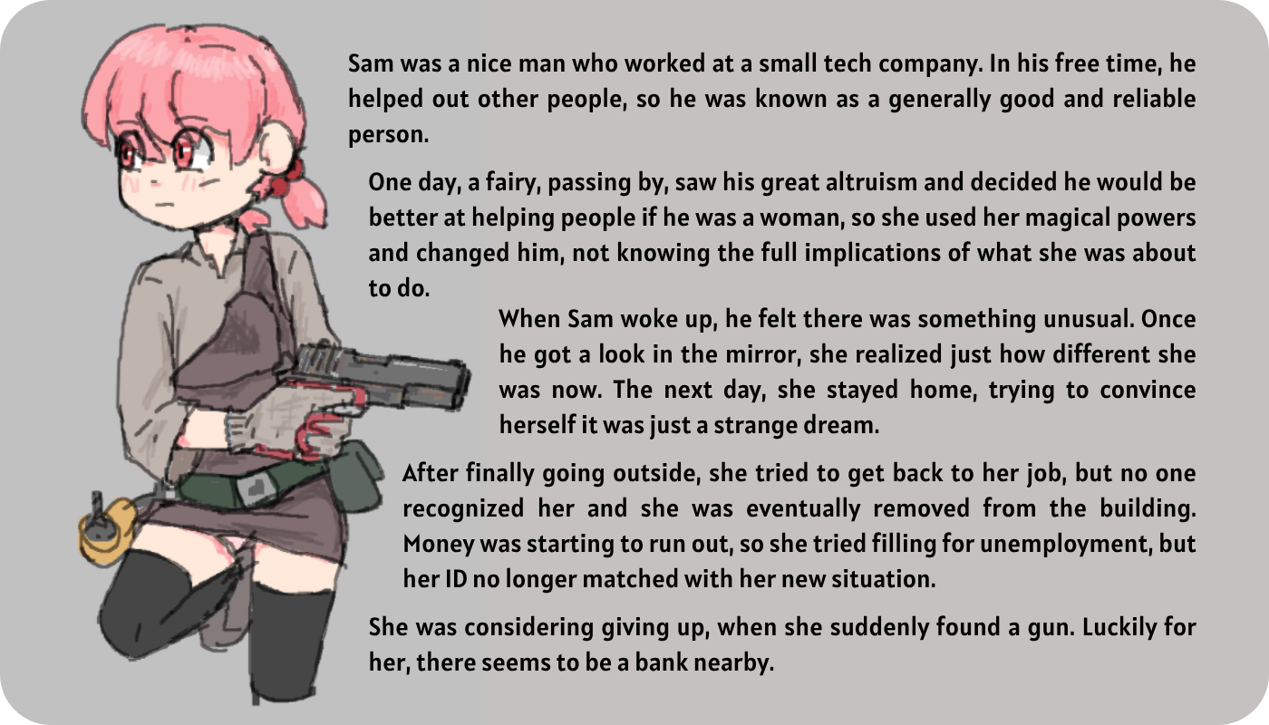 She was considering giving up, when she suddenly found a gun. Luckily for her, there seems to be a bank nearby.