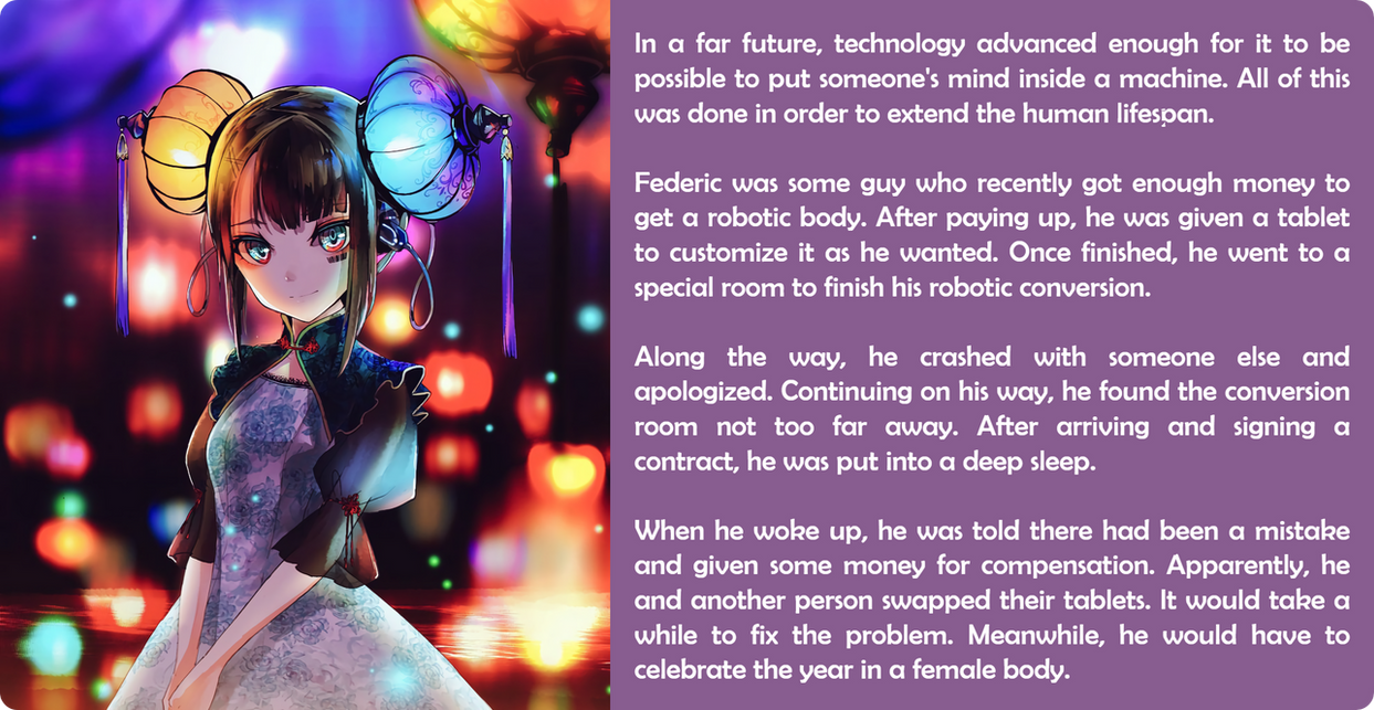 When he woke up, he was told there had been a mistake and given some money for compensation. Apparently, he and another person swapped their tablets. It would take a while to fix the problem. Meanwhile, he would have to celebrate the year in a female body.