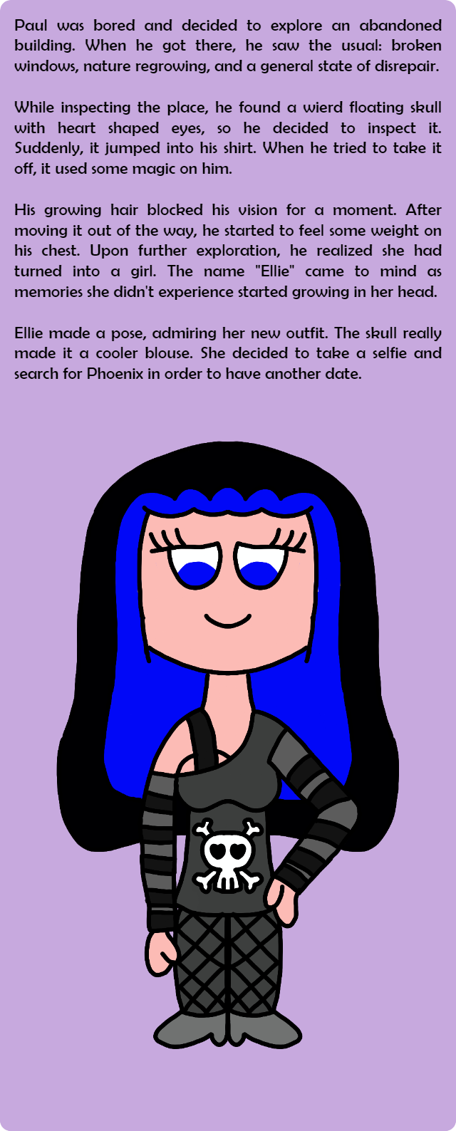 Ellie made a pose, admiring her new outfit. The skull really made it a cooler blouse. She decided to take a selfie and search for Phoenix in order to have another date.