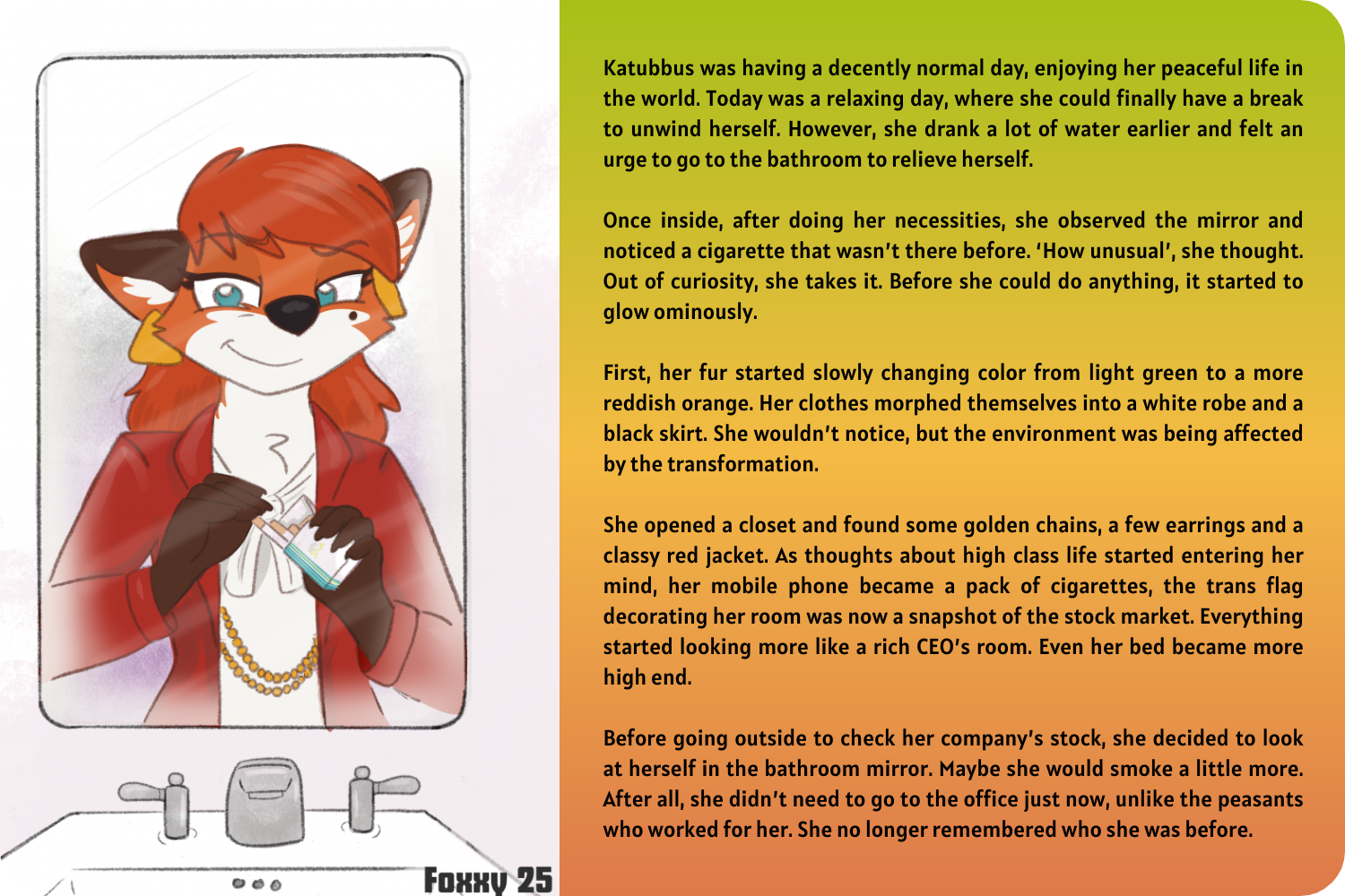 First, her fur started slowly changing color from light green to a more reddish orange. Her clothes morphed themselves into a white robe and a black skirt. She wouldn't notice, but the environment was being affected by the transformation.