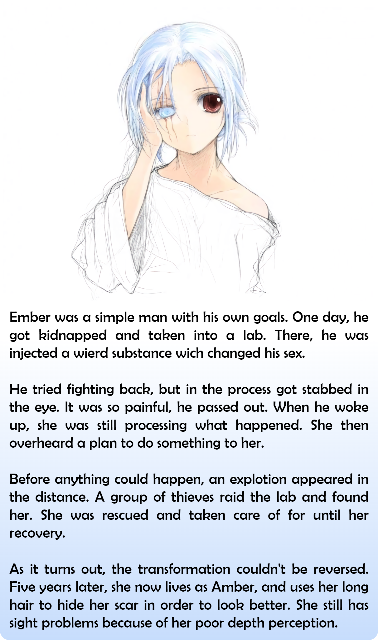 Ember was a simple man with his own goals. One day, he got kidnapped and taken into a lab. There, he was injected a wierd substance wich changed his sex.