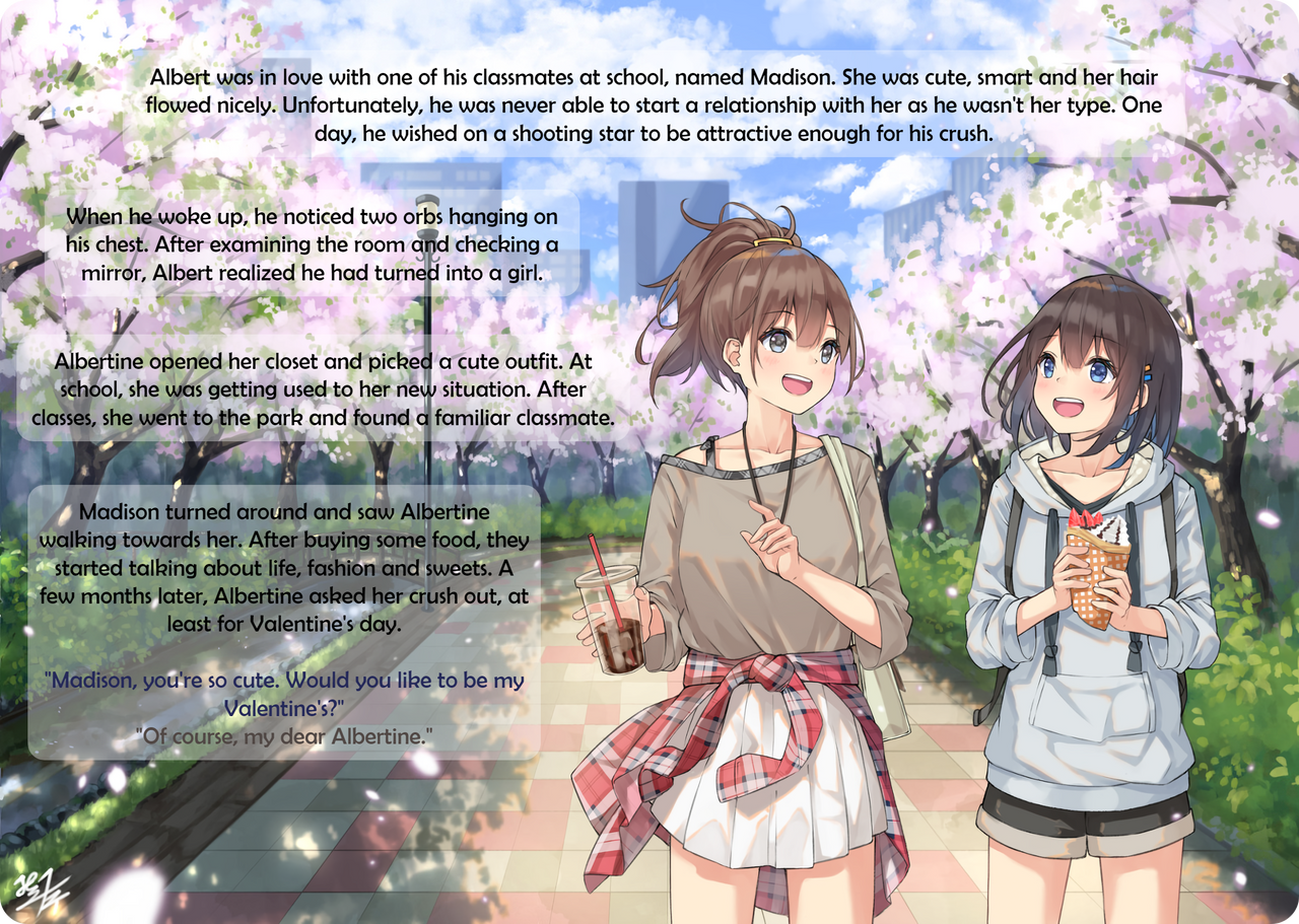 Madison turned around and saw Albertine walking towards her. After buying some food, they started talking about life, fashion and sweets. A few months later, Albertine asked her crush out, at least for Valentine's day.