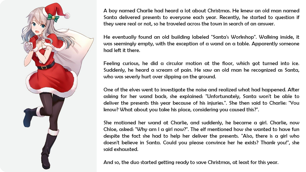 Feeling curious, he did a circular motion at the floor, which got turned into ice. Suddenly, he heard a scream of pain. He saw an old man he recognized as Santa, who was severly hurt over slipping on the ground.